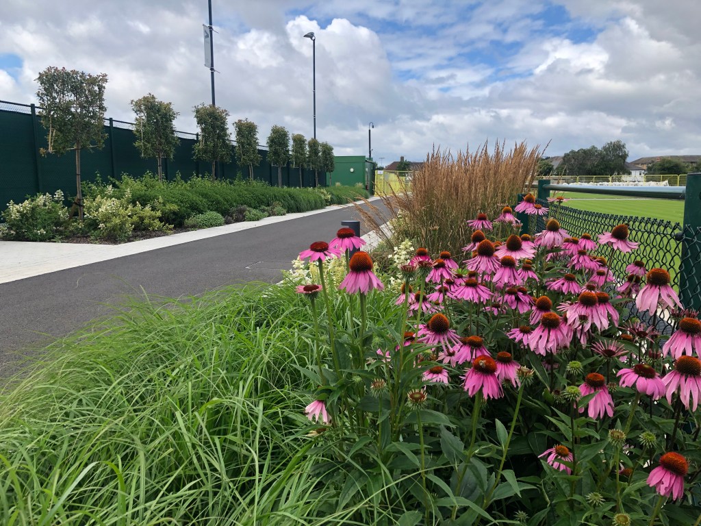 Sitting on a heavy clay soil, the existing site was prone to waterlogging and occasional overland flows and so a fully integrated SuDS scheme was developed to attenuate the volume of water and provide storage for watering the courts